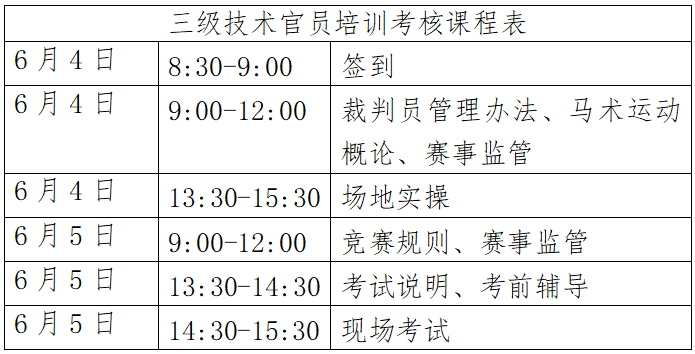 根據(jù)馬術(shù)專業(yè)人才培養(yǎng)計(jì)劃,我協(xié)會將與廣東省馬術(shù)協(xié)會于2024年6月4日-5日舉辦馬術(shù)場地障礙三級技術(shù)官員培訓(xùn)考核活動(dòng),合格者授予中國馬術(shù)協(xié)會相應(yīng)等級技術(shù)官員證?,F(xiàn)就本次培訓(xùn)考核相關(guān)事宜通知如下:
