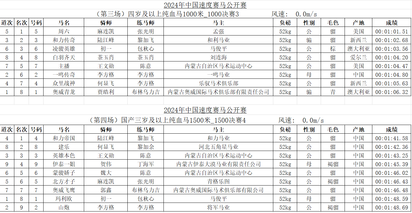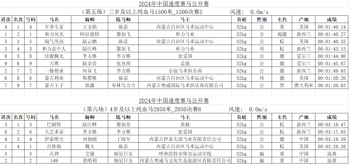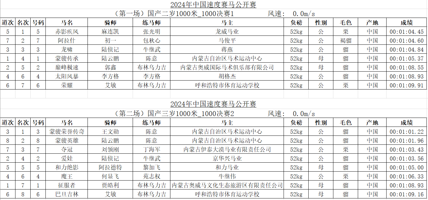 2024年中國速度賽馬公開賽(呼和浩特站)成績表