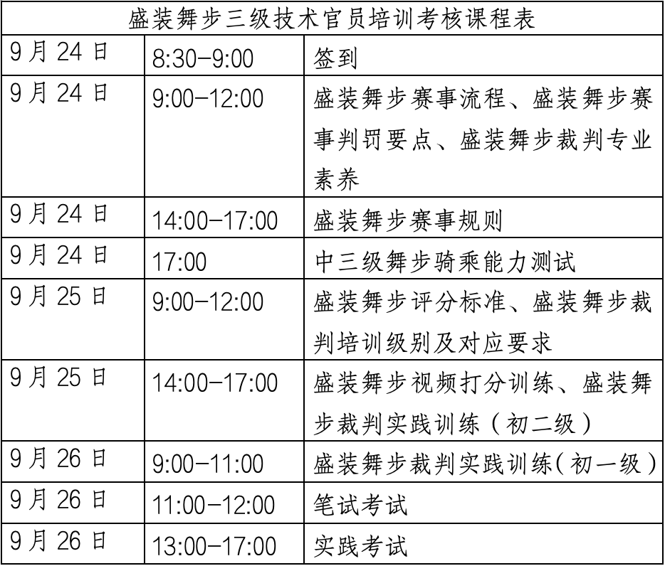2. 盛裝舞步三級(jí)技術(shù)官員培訓(xùn)考核收取報(bào)名費(fèi):1650元,如有學(xué)員因盛裝舞步中三級(jí)測試未通過無法參加后續(xù)實(shí)踐考核將退還考核費(fèi)800元,租馬費(fèi)不退。