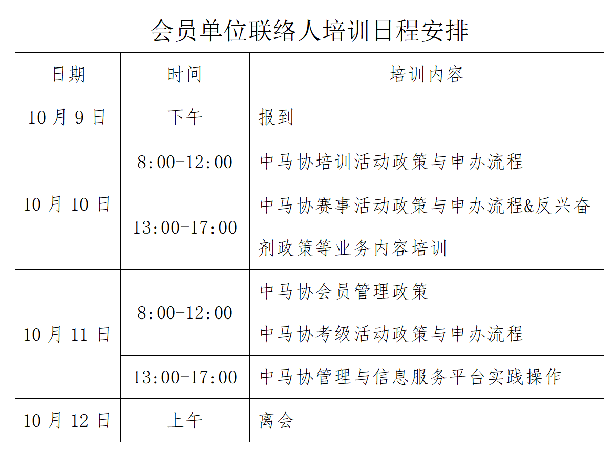 為進(jìn)一步提高中馬協(xié)會(huì)員單位聯(lián)絡(luò)人政策掌握水平與業(yè)務(wù)對(duì)接能力。我協(xié)會(huì)將于2024年10月9日到10月11日在武漢市舉辦會(huì)員單位聯(lián)絡(luò)人培訓(xùn)(南方站)活動(dòng)?,F(xiàn)就本次培訓(xùn)考核相關(guān)事宜通知如下: