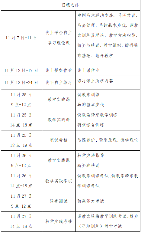 (三)線下輔導(dǎo)和實(shí)踐考核:2024年11月25日-27日,在浙江省寧波市天驛興嘉馬術(shù)俱樂(lè)部進(jìn)行線下集中輔導(dǎo)與實(shí)踐考核。