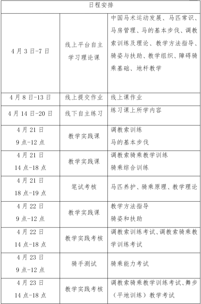 (三)線(xiàn)下輔導(dǎo)和實(shí)踐考核:2025年4月21日-23日,在秦漢新城國(guó)際馬術(shù)中心進(jìn)行線(xiàn)下集中輔導(dǎo)與實(shí)踐考核。