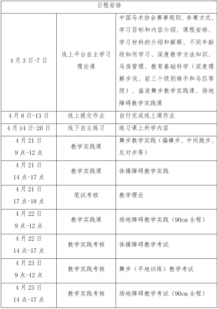 (三)線下輔導(dǎo)和實(shí)踐考核:2025年4月21日-23日,在秦漢新城國際馬術(shù)中心進(jìn)行線下集中輔導(dǎo)與實(shí)踐考核。