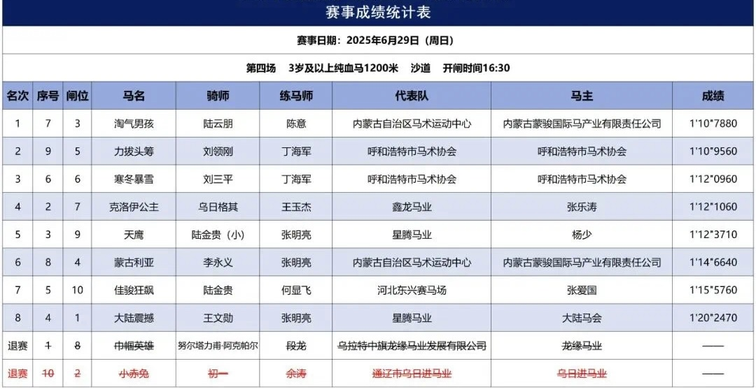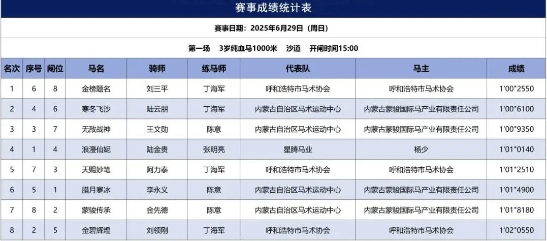 2025年6月29日,2025中國速度賽馬公開賽(呼和浩特站-蒙駿)在內(nèi)蒙古呼和浩特市少數(shù)民族群眾文化體育運動中心順利舉行。各參賽馬匹成績?nèi)缦拢?/p>