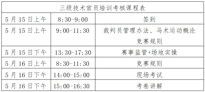 根據(jù)馬術(shù)專業(yè)人才培養(yǎng)計(jì)劃,我協(xié)會將于2021年5月15日-16日在長馳國際馬術(shù)俱樂部舉辦三級技術(shù)官員培訓(xùn)考核活動(dòng),合格者授予中國馬術(shù)協(xié)會相應(yīng)等級技術(shù)官員證?,F(xiàn)就本次培訓(xùn)考核相關(guān)事宜通知如下: