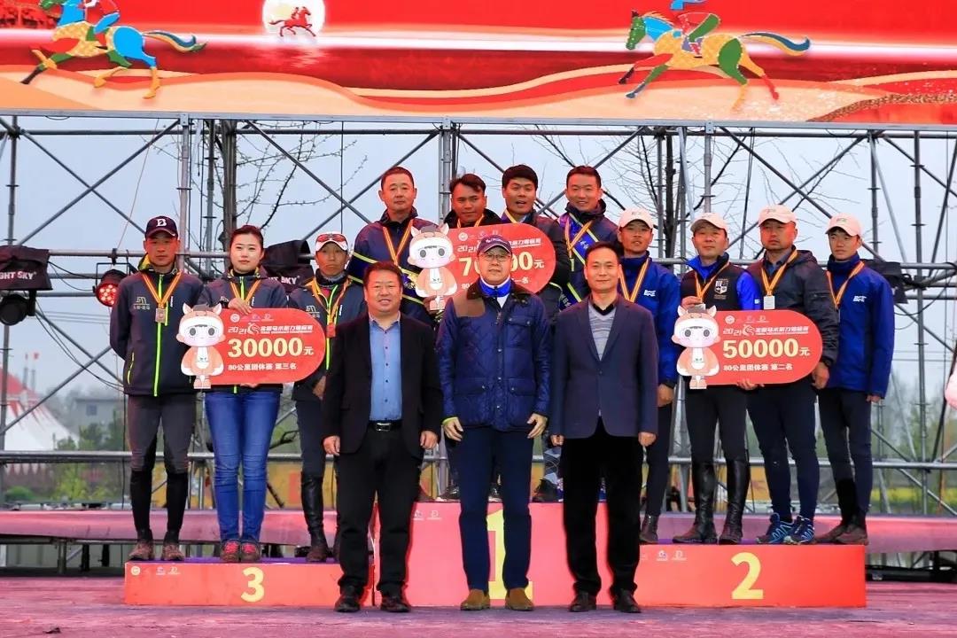 圖為2021全國馬術(shù)耐力錦標(biāo)賽80公里團(tuán)體賽前三名代表隊(duì)頒獎現(xiàn)場