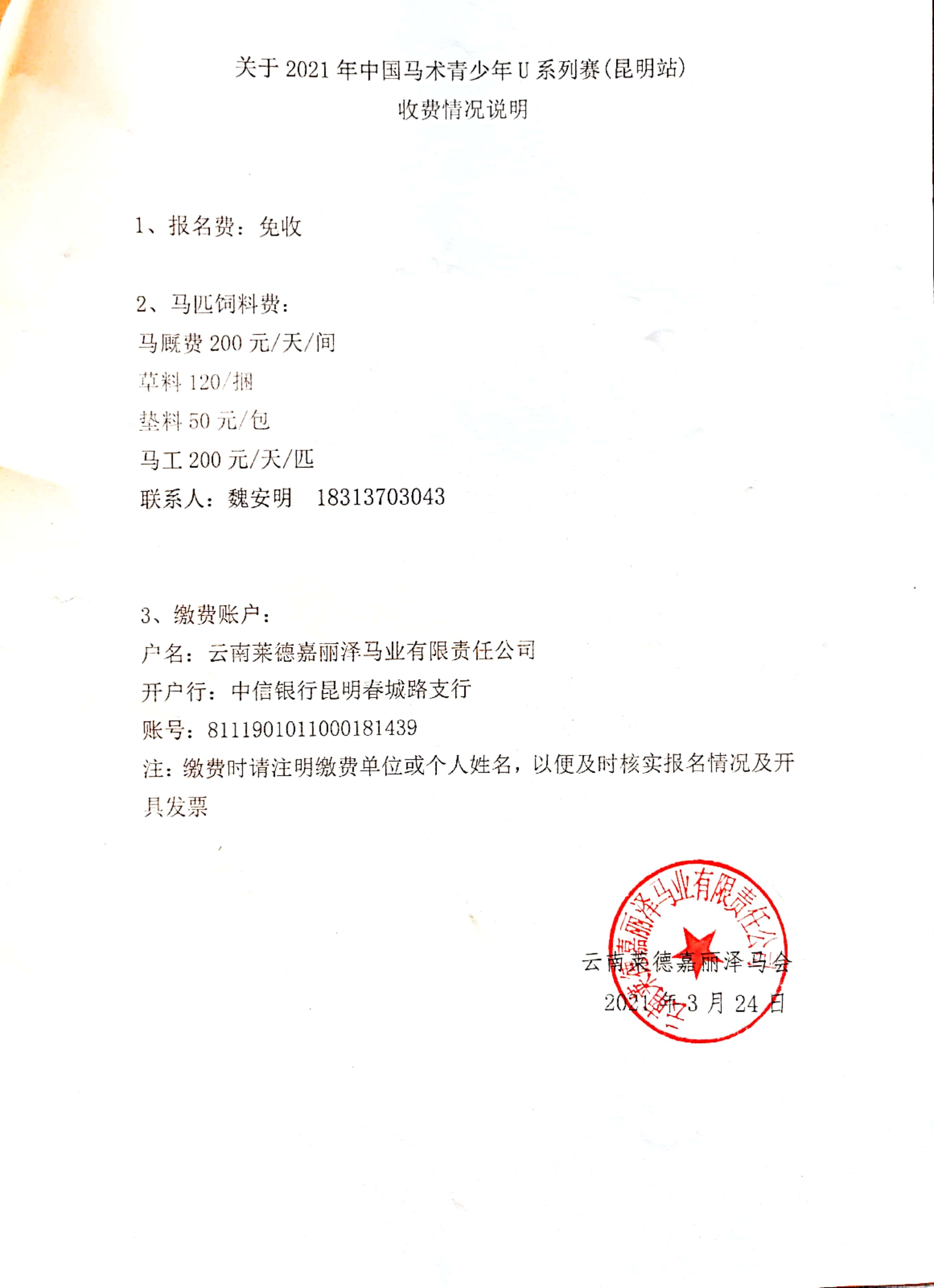 本次比賽報名請?zhí)顚憽?021年中國馬術(shù)青少年U系列賽(昆明)報名表》,并將加蓋公章的報名表電子版發(fā)送至郵箱: