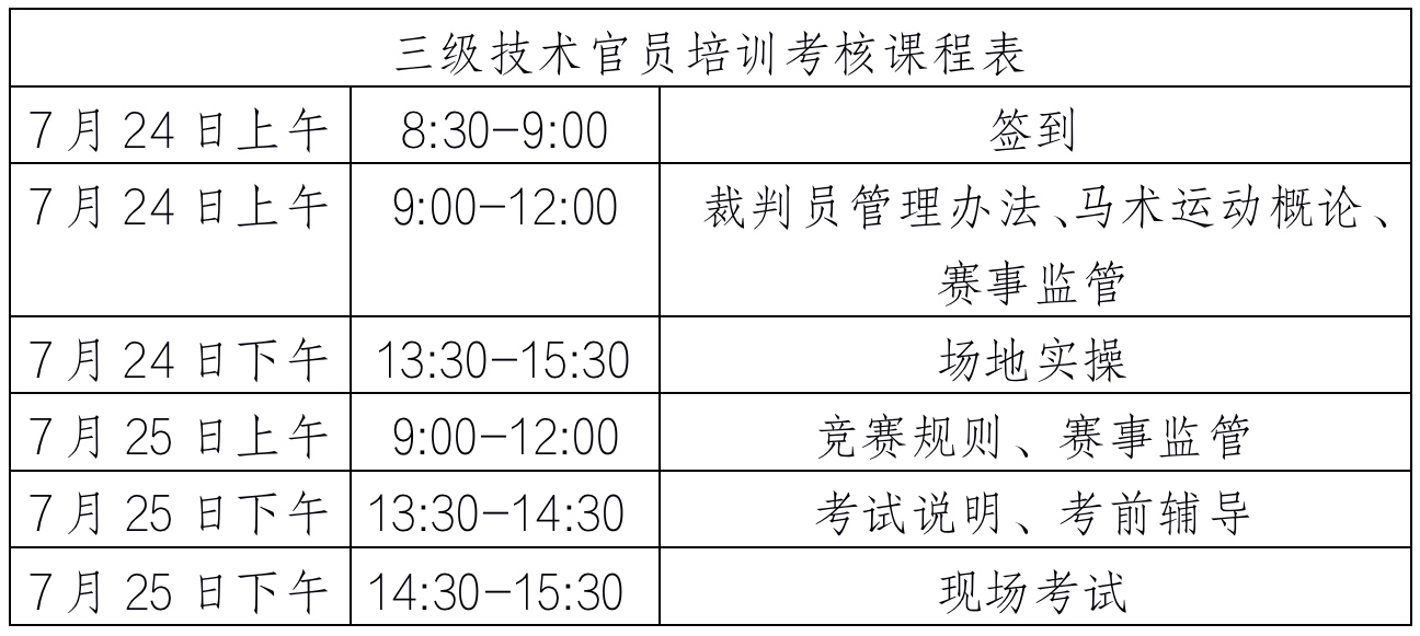 根據(jù)馬術專業(yè)人才培養(yǎng)計劃,我協(xié)會將于2021年7月24日-25日在豐臺區(qū)馬術訓練基地舉辦三級技術官員培訓考核活動,合格者授予中國馬術協(xié)會相應等級技術官員證?,F(xiàn)就本次培訓考核相關事宜通知如下: