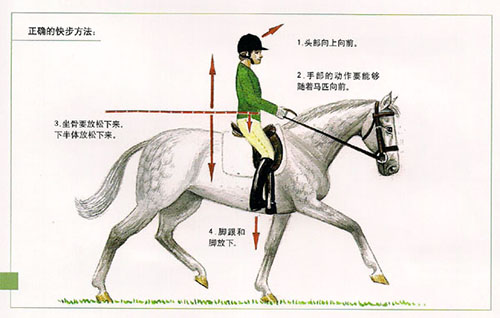 練習(xí)快步同樣要求正確的身體姿勢(shì),就如下列圖例所示那樣,要讓你整個(gè)身體的運(yùn)動(dòng)隨著馬匹的運(yùn)動(dòng),接收馬匹對(duì)你的支撐力和你給馬匹的壓力要盡量持平,檢查如下: