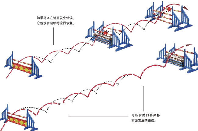 去看其他馬匹跳關(guān)系障礙也是很有用的,有助于你去思考如何跳。但是要小心,不要誤解,別的馬匹不一定與你的馬匹相同。在關(guān)系障礙中,如果你的馬匹在第一道障礙出現(xiàn)錯(cuò)誤,這個(gè)關(guān)系障礙就不會(huì)跳得很好。它落地有可能太遠(yuǎn)或太近,那么也會(huì)讓后面障礙的距離太近或太遠(yuǎn)。