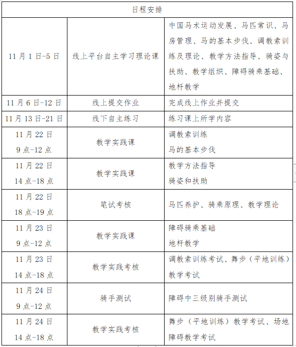 (三)線下輔導(dǎo)和實踐考核:2021年11月22日-24日,在無錫陽山夢想馬術(shù)學(xué)府進(jìn)行線下集中輔導(dǎo)與實踐考核。
