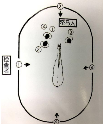 •牽馬人需根據(jù)檢查人員站立位置的變化,遵照以下幾點(diǎn)對(duì)馬匹進(jìn)行保定