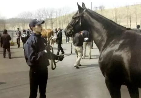 •牽馬人左手持韁,一邊關(guān)注著檢查人員的動(dòng)向,一邊讓馬匹以左側(cè)為正面的姿勢(shì)站好。